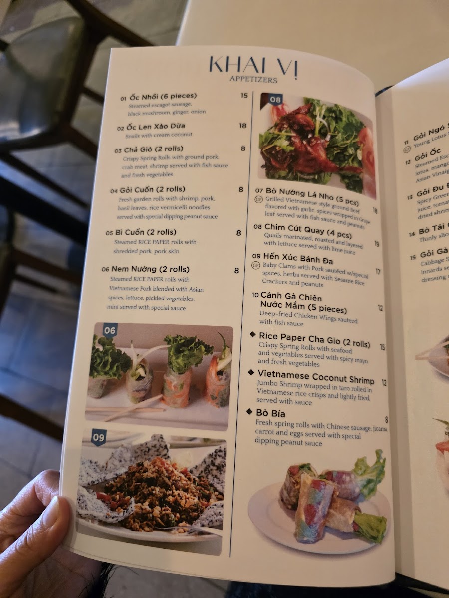The menu at Rice Paper - Taste of Vietnam offers a broad selection of Vietnamese and Pho dishes, structured to accommodate a variety of dining preferences. It features traditional hotpots, rice platters, and noodle dishes such as Pho and Bun Cha. There are multiple appetizer options including Summer Rolls, Spring Rolls (Cha Gio), and Escargot, complemented by special items like Grilled Lemongrass Beef served with rice paper and Young Lotus Stem Salad with Shrimp and Pork.